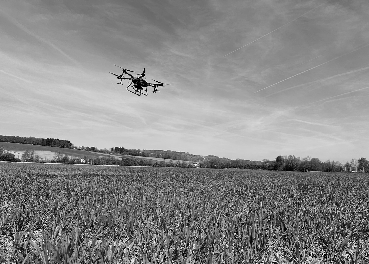 Einsatz auch bei Nässe und unbefahrbarem Boden. Die Drohne fliegt zuverlässig, selbst wenn Traktoren stillstehen.