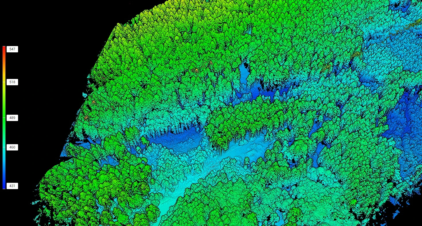 Digitales Abbild Ihrer Waldfläche mit Baumhöhen, Gelände und Struktur für Planung und Dokumentation.